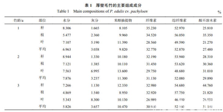 竹材是速生型植物資源,具有生長(zhǎng)快、易繁 殖、產(chǎn)量高、再生能力強(qiáng)等特點(diǎn),通過(guò)合理間 伐,可永續(xù)利用,是理想的代木材料。厚壁毛竹 ( Phyllostachys edulis cv. pachyloen) 是 20 世 紀(jì) 80 年代發(fā)現(xiàn)的一種毛竹變種,其稈略呈四方 形,稈壁率是毛竹的 2.0 倍,胸徑部位絕對(duì)厚度 可達(dá) 2.5 cm 以上,是等徑毛竹的 1.8 倍,出材率 比一般的毛竹要高,具有較高的研究和應(yīng)用價(jià) 值。目前,厚壁毛竹在生物質(zhì)能源及化學(xué)品等高 值化應(yīng)用尚處于起步階段,其化學(xué)成分的類(lèi)別 和含量直接影響厚壁毛竹材性和利用價(jià)值,尤其 對(duì)人造板應(yīng)用和制漿造紙影響較大。有研究指 出,不同年份和不同部位厚壁毛竹的主要成分含 量具有較大的差異性。基于此,本研究以 1 年 生、2 年生、5 年生厚壁毛竹為對(duì)象,研究其中 稈、枝、葉部位不同部位化學(xué)成分類(lèi)別和含量變 化規(guī)律,以期為厚壁毛竹的合理利用提供參考。