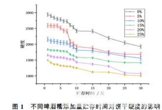 由圖 1 可知,啤酒糟添加量為 10% 、15% 、20% 、 25% 的餅干的硬度變化趨勢(shì)明顯低于未添加啤酒糟的餅干。另外,未加啤酒糟的餅干硬度在貯存過程中 下降幅度較大,而添加啤酒糟的餅干硬度在貯存過程 中下降幅度相對(duì)較小,而且隨著啤酒糟加量增加,貯 存過程下降幅度也有縮小的趨勢(shì)。