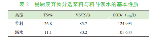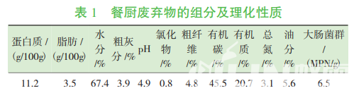 沉砂浮渣一體化分離裝置 (V=500 L,無錫久 諾);攪拌機 (0~83 r/min,美國米頓羅);沉砂沖 洗泵 (Q=6 m3 /h,P=0.75 kW,浙江新界泵業);程 控箱式電爐 (SXL-1008,300~1 000 ℃,上海精 宏);電熱恒溫鼓風干燥箱 (DHG-9246A,上海精宏);電子天平 1 (ME204/02,0.01~200 g,梅特勒 - 托利多);電子天平 2 (YP2001N,2 kg,上海精 科);消解器 (DRB200,美國哈希);可見分光光 度計 (DR3900,美國哈希);精密 pH 計(PHS-3E, 上海雷磁)。 以常州餐廚廢棄物綜合處置一期工程收運的 餐廚垃圾作為試驗原料,該處置廠的餐廚垃圾日 處理能力為 200 t/d,主體采用預處理 + 油脂提取 + 厭氧消化工藝。餐廚垃圾組分及理化性質見表 1。