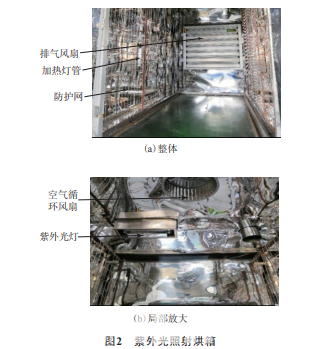 為橡膠密封條光觸媒除味設(shè)計的真空烘箱(上海精宏DZF-6090)如圖2所示,該烘箱的紫外光照射強度遠遠高 于正常太陽光的紫外光強度,且適應(yīng)橡膠密封條 的批量處理。烘箱中加熱燈管保證烘箱處于一定 的溫度范圍內(nèi),空氣循環(huán)風扇保證空氣循環(huán)和烘 箱內(nèi)溫度分布均勻,紫外光燈分布在烘箱頂部和 兩側(cè),保證橡膠密封條在處理過程中被全面照射, 提高處理效率。