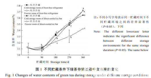 茶葉含水率是影響茶葉品質(zhì)的關(guān)鍵因素。由圖 1 可知,各貯藏環(huán)境下的茶葉含水 率均隨著存儲時間的延長而增加,其中 90~360 d 貯藏期內(nèi)的茶葉含水率變化幅度較 大,而風(fēng)冷冷凍的含水率增幅最小。貯藏 360 d 時,風(fēng)冷冷凍的含水率最低(P<0.05),為 3.42%,與原樣相比僅增加 9.94%,風(fēng)冷冷藏 和直冷冷凍的含水率為 3.72%,最高于其他兩 種(P<0.05),與原樣相比增加 19.23%。由此 可知,綠茶長期貯藏時,風(fēng)冷冰箱中的冷凍室 最有利于茶葉原含水率的保持,其余貯藏條件 的含水率相對較高,但也均在茶葉合理的含水 率范圍內(nèi)(小于 5%)。在茶葉起始含水率 相同的情況下,其貯藏過程中水分對其品質(zhì)的 影響主要來自于環(huán)境濕度,環(huán)境濕度在 10%~45%時,茶葉增濕最小,風(fēng)冷冰箱和 直冷冰吧均達到此要求,區(qū)別在于風(fēng)冷冰箱通 過風(fēng)扇強制空氣進行制冷,空氣流動性大,直 冷冰吧則通過蒸發(fā)器進行自然對流,故同為冷 藏室環(huán)境濕度前者波動范圍(25%~45%)小 于后者(34.1%~34.5%),即直冷冰吧更能精 確的控制濕度。各貯藏環(huán)境下茶葉含水率的變 化與冰箱、冰吧自身的制冷方式不同導(dǎo)致微域 環(huán)境的差別有關(guān)。