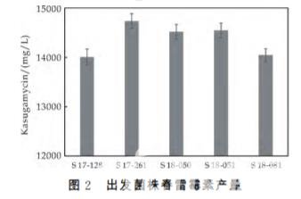 將不同批次的發(fā)酵罐中篩選到的具有遺傳多 樣性的菌株作為出發(fā)菌株,利用小金色鏈霉菌(S. microaureus)分離平 板 篩 選 到 了 到5株 遺 傳 差 異 大的菌株,分別為 S17-128,S17-261,S18-050,S 18-051,S18-081,這5株菌株作為 Genomeshuff- ling的出發(fā)菌株.產(chǎn)量最高的菌株S17-261的春雷 霉素產(chǎn)量為14738mg/L,見圖2所示。