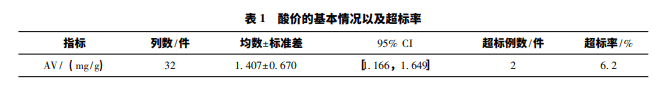 根據(jù)表 1 的結(jié)果,在 32 件實(shí)驗(yàn)樣品中,樣品合 格數(shù)為 30 件,樣品合格率為 93. 8%,不合格樣品的 酸價(jià)分別為: 3. 1mg / g 和 3. 2mg / g。