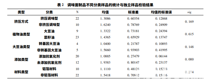 通過對(duì)樣品分類統(tǒng)計(jì)和分別進(jìn)行獨(dú)立樣品 t 檢驗(yàn) 得到如下表 2,包括按產(chǎn)品制作方式、原料用油種類、 原料用油的轉(zhuǎn)基因與否、添加抗氧化劑與否及包裝質(zhì) 地為鋁箔材料與否 5 方面進(jìn)行分類分析,并統(tǒng)計(jì)了各組分類的觀測(cè)量個(gè)數(shù)、平均數(shù)、標(biāo)準(zhǔn)差和平均數(shù)的標(biāo) 準(zhǔn)誤差。其中僅有添加抗氧化劑類型的分析檢驗(yàn) sig< 0. 05,所以表明調(diào)味面制品的酸價(jià)值的大小與抗氧化 劑的添加與否有顯著差異,其余均無顯著差異。