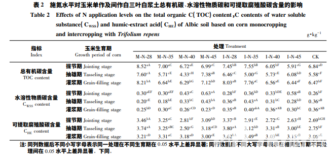 從表 2 可知: M-N-28、M-N-35、M-N-40、I-N-28、I-N-35 和 I-N-40 處理 TOC 含量均呈先降低后增加的趨 勢(shì),而 M-N-45 處理 TOC 含量則呈先增加后降低的趨勢(shì),I-N-45 處理 TOC 含量逐漸上升。與拔節(jié)期相比, 玉米灌漿期單作栽培模式只有在施氮水平增至 225 kg·hm-2 時(shí) TOC 含量增加了 1.9%,其他 3 個(gè)施氮水平下 TOC 含量均降低; 基于玉米間作白三葉栽培模式,4 個(gè)施氮水平下白漿土 TOC 含量均增加,I-N-28、 I-N-35、I-N-40 和 I-N-45 處理,分別增加 7.8%、2.8%、8.4%和 9.0%,其中 I-N-45 處理的增幅最大。與 CK 相比,灌漿期 M-N-28、M-N-35、M-N-45、I-N-28、I-N-35 和 I-N-40 處理 TOC 含量分別增加 26. 9%、2. 6%、 10.0%、24.1%、19.9%和 1.4%,M-N-40 處理 TOC 含量降低了 2.7%,I-N-45 處理與 CK 相比無(wú)顯著差異???見,玉米單作模式下施氮量為 200 kg·hm-2 時(shí)對(duì)白漿土 TOC 含量的消耗最大,而在玉米間作白三葉栽培模 式下,TOC 含量隨施氮水平的增加而降低,在玉米間作白三葉模式下較低施氮水平更有助于 TOC 含量的 保蓄。